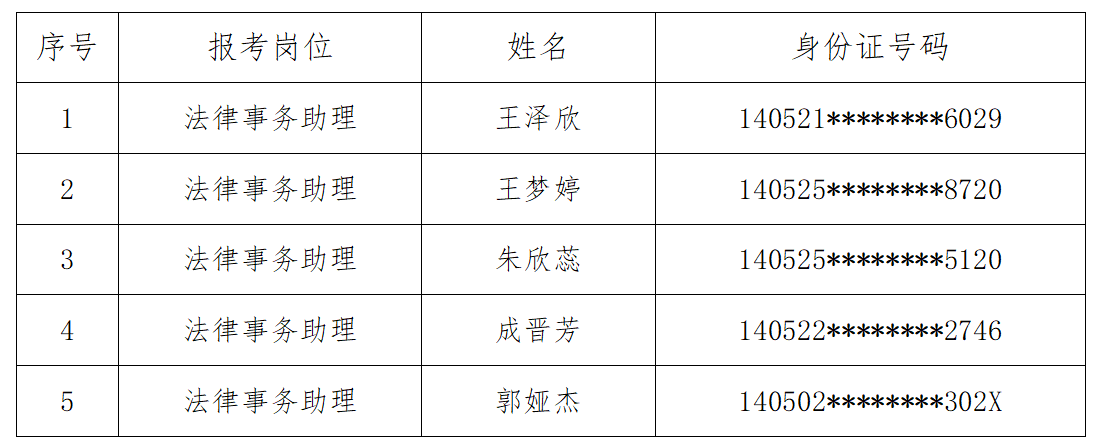 根據鑫富源人力資源公司2025年2月17日發布的《晉城市城區人民法院招聘法律事務助理公告》要求,經公開報名、資格初審、筆試、資格復審、面試、體檢、政治審查等環節,現將符合錄用條件的人員公示如下: